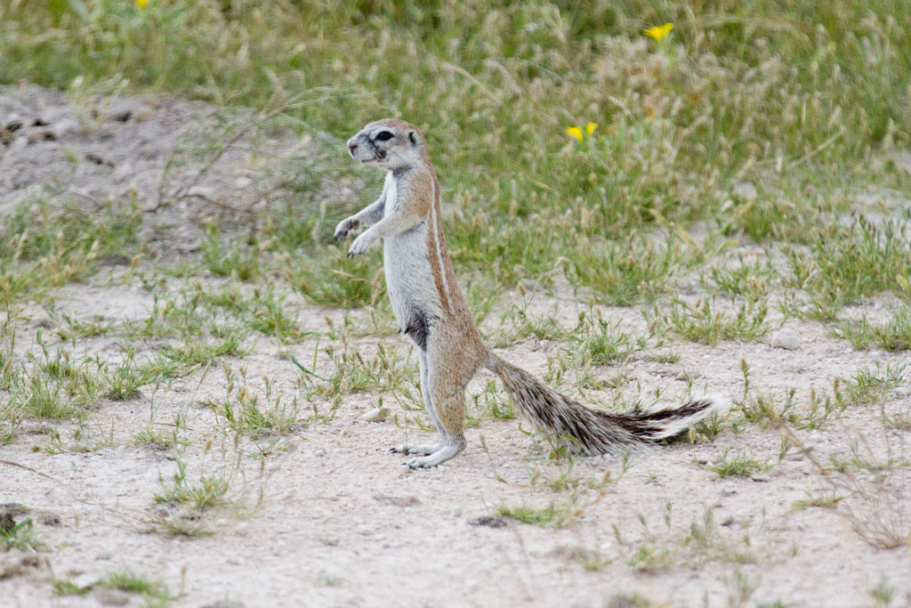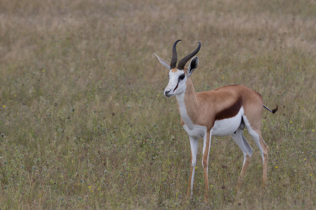 Die weitere Reise zeigte viele Springböcke (wirklich viele), Gnus (nix mit Computer und so), Trappen, Mangusten, Impalas und Erdhörnchen. Dann blieben wir länger an einem Ort. Der Grund war nicht leicht zu sehen, nur eine mittelgroße Tatze ragte aus dem Gras. Tatsächlich, ein Löwenpaar. Um uns herum noch 3 andere große Touristenfahrzeuge die alle versuchten etwas zu erkennen. Es passierte nicht viel. Es sind eben Katzen. Dazu kommt, dass es warm war und noch früher Nachmittag. Da bewegt sich eine Katze nicht so viel. Irgendwann gelang es unserem Guide, die Aufmerksamkeit der Katzen wenigstens kurz auf ihn zu lenken, so das die Katzen wenigstens mal den Kopf hoben um aus dem Gras zu ragen. Es sind dann noch ein paar Bilder entstanden.