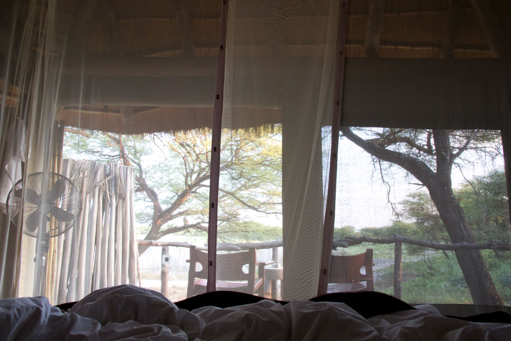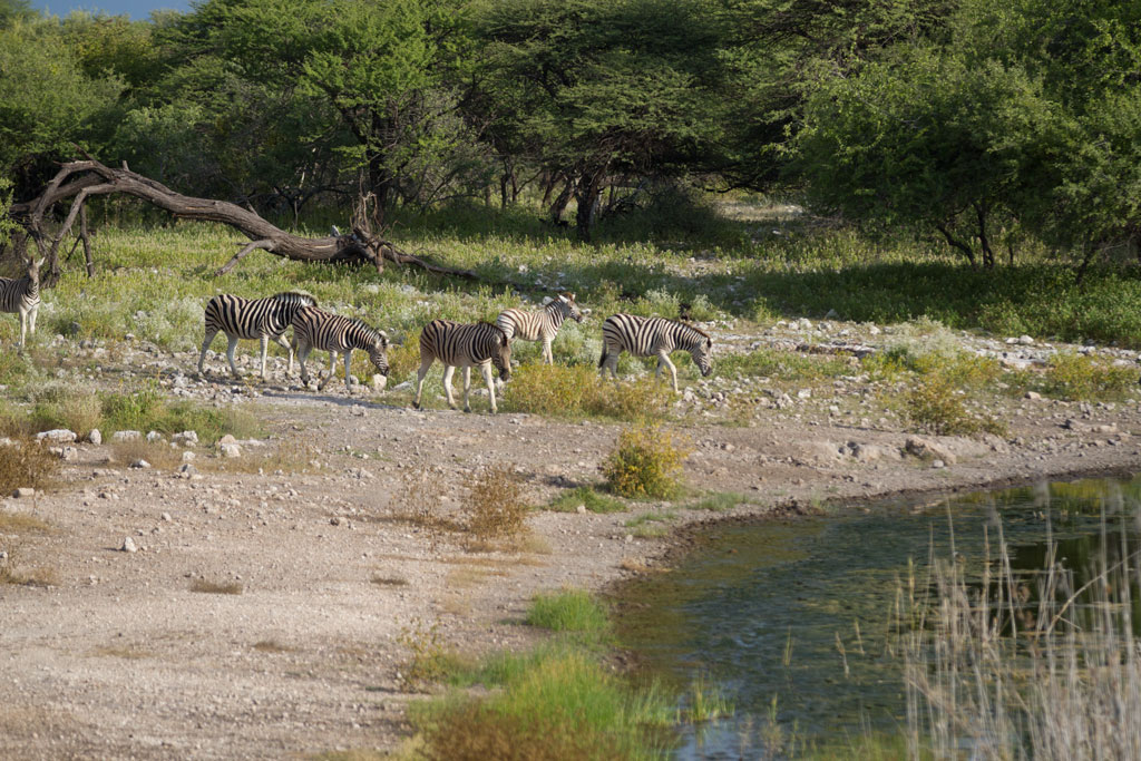 Man wacht also wieder zur Morgendämmerung auf und erkennt selbst mit halb geschlossenen Augen, dass gegenüber im Baum eine Eule sitzt. Wenig später kommen die ersten Impalas zum trinken. Nach einer Weile schließen sich Zebras und sogar Gnus an. Immer wieder kommen auch Vögel und fliegen herum. Manch einer klingt als würde man eine alte Tür öffnen, die lange kein Öl gesehen hat 🙂
